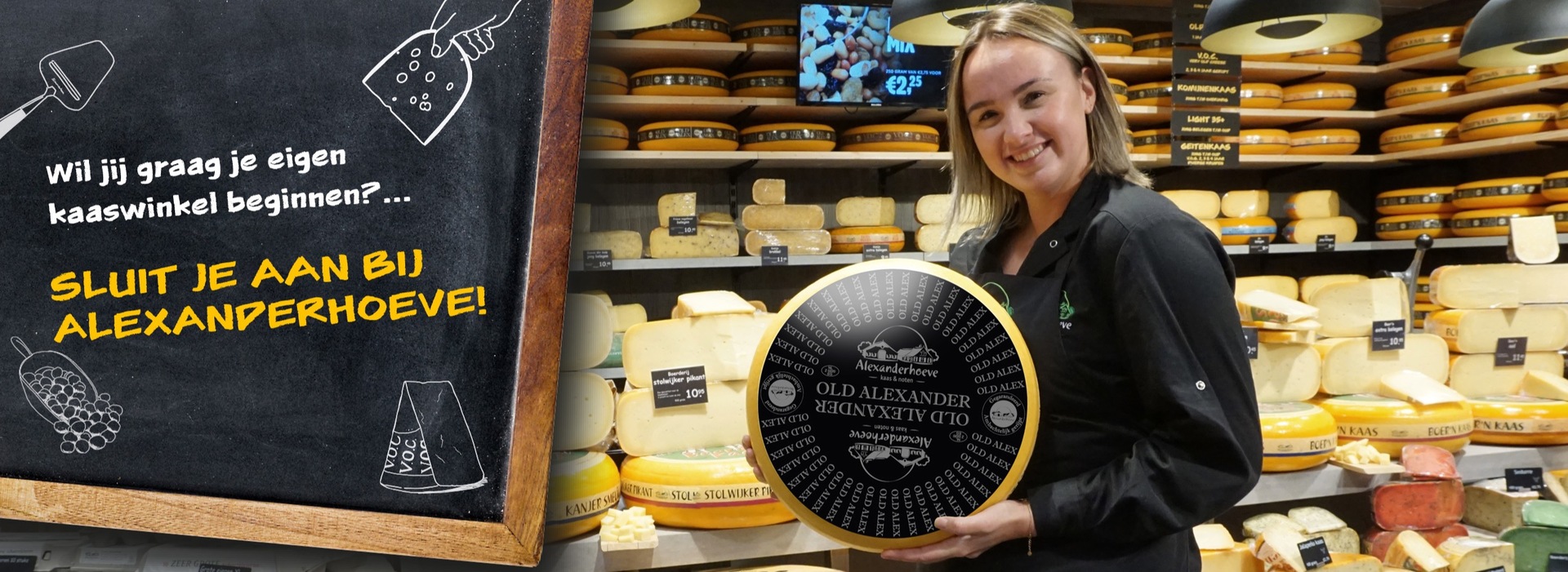 Altijd al een winkel in kaas, noten, wijn en andere delicatessen willen hebben en willen genieten van de voordelen van een reeds gevestigd merk? Alexanderhoeve biedt ondernemers (in spé) de kans om franchisenemer te worden onder de vlag van Alexanderhoeve. Je runt je eigen winkel op de al dan niet zelf aangedragen locatie, terwijl je geniet van topproducten én de voordelen en kennis van Alexanderhoeve.