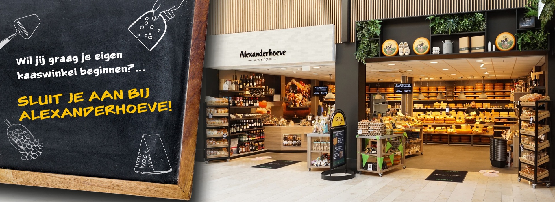 Wat dacht je van een winkel met een groot assortiment aan kaas, noten, wijn en andere delicatessen? Word dan franchisenemer bij Alexanderhoeve. Dit is dé gelegenheid om je eigen zaak te starten. Of misschien heb je al een eigen winkel en wil je je bij ons aansluiten? Wij zijn regelmatig op zoek naar franchisenemers in heel Nederland.